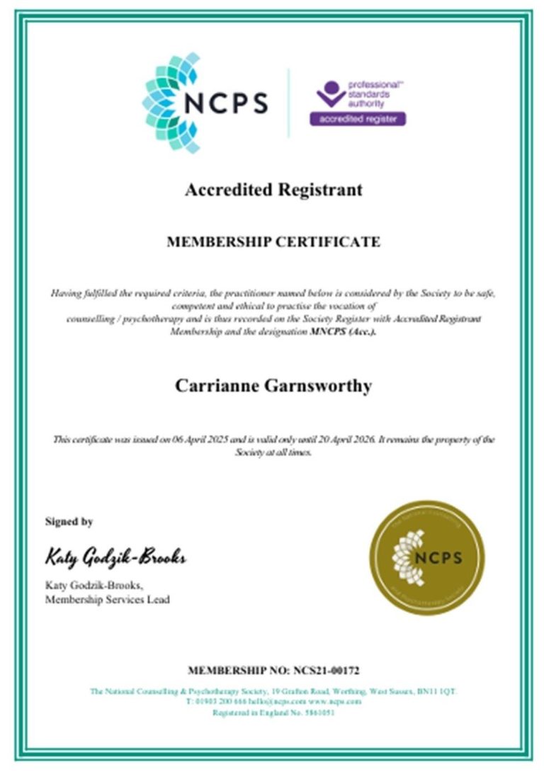 During the Covid-19 pandemic, I was truly shocked and moved by the devastating effects this mass trauma was having on our society, young and old, student and teacher. It did however, inspire me to train further so I could provide meaningful talking therapy services to anyone in need. I completed my studies for a Diploma in Professional Psychotherapeutic Counselling Practices and am now an accredited member of the National Counselling and Psychotherapy Society.